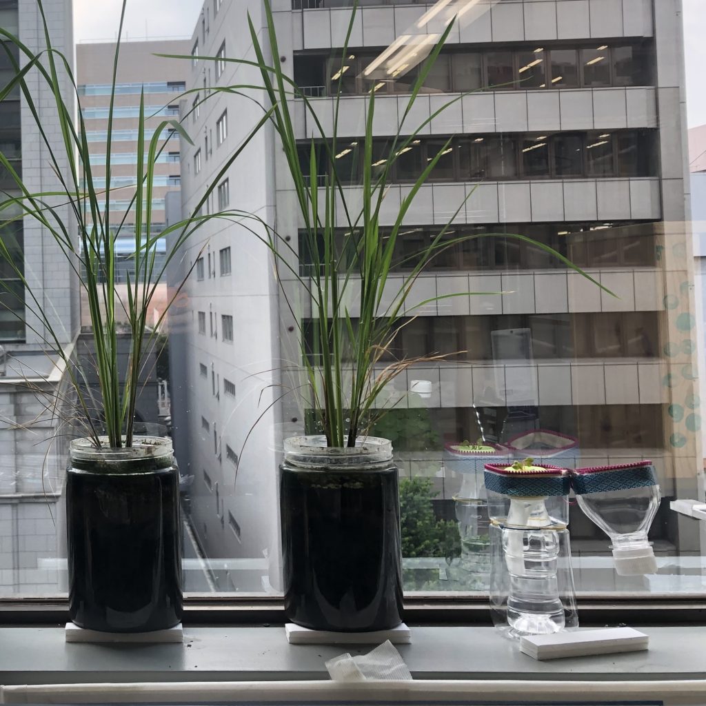 名古屋市中区、錦通り沿いのオフィスの窓辺でポット稲と並べて育ててます。なぜか都会な感じだなぁ(笑)。焼酎のいいちこのポスターみたい。